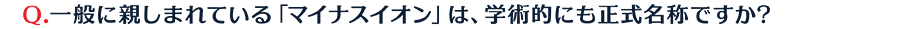 正式名称は、「負イオン」といいます。気体中などに存在できるものを「負イオン」と呼ぶことが、大気科学の分野では一般的です(瀋液中などに存在するものは、化学の分野では「陰イオン」「アニオン」と呼んでいます)。