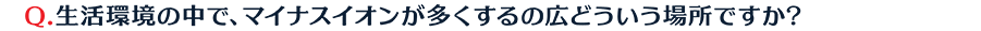 マイナスイオンが一番多い場所は、戸も「滝のそば」だといわれています。川があり空気が澄んだ森林地帯が、そのバックにあるから必然的にマイナスイオンが多く発生します。水滴の飛ぶ滝のそばは大量のイオンが発生しますが、大イオンのプラスイオンは時間とともに下方に落ちて、小さくて軽いマイナスイオンは空中に浮遊し、その清澄な空気を吸うことで人体の各細胞が活性化されると言われています。