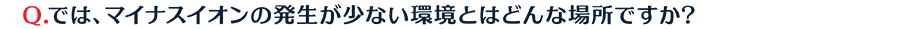 部屋の中で、これらプラスイオンにマイナスイオンがぶつかると、電気的には中和し質量が増えて下に落ちます。こまめに掃除することを勧めます。マイナスイ オンが容易に確保される場合は問題ないのですが、都会での生活環境は家電製品を多く利用するため、電磁波などプラスイオンが大量に発生する状況にあります。 普段から意識しながら生活しましよう。